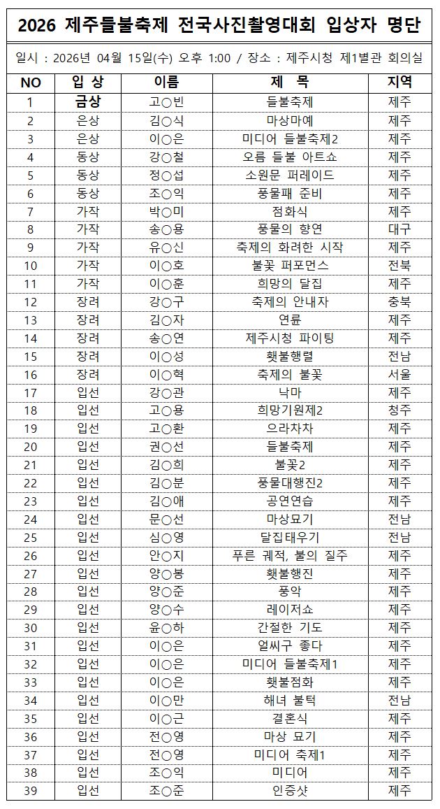 2026 제주들불축제 전국사진촬영대회 심사결과 발표